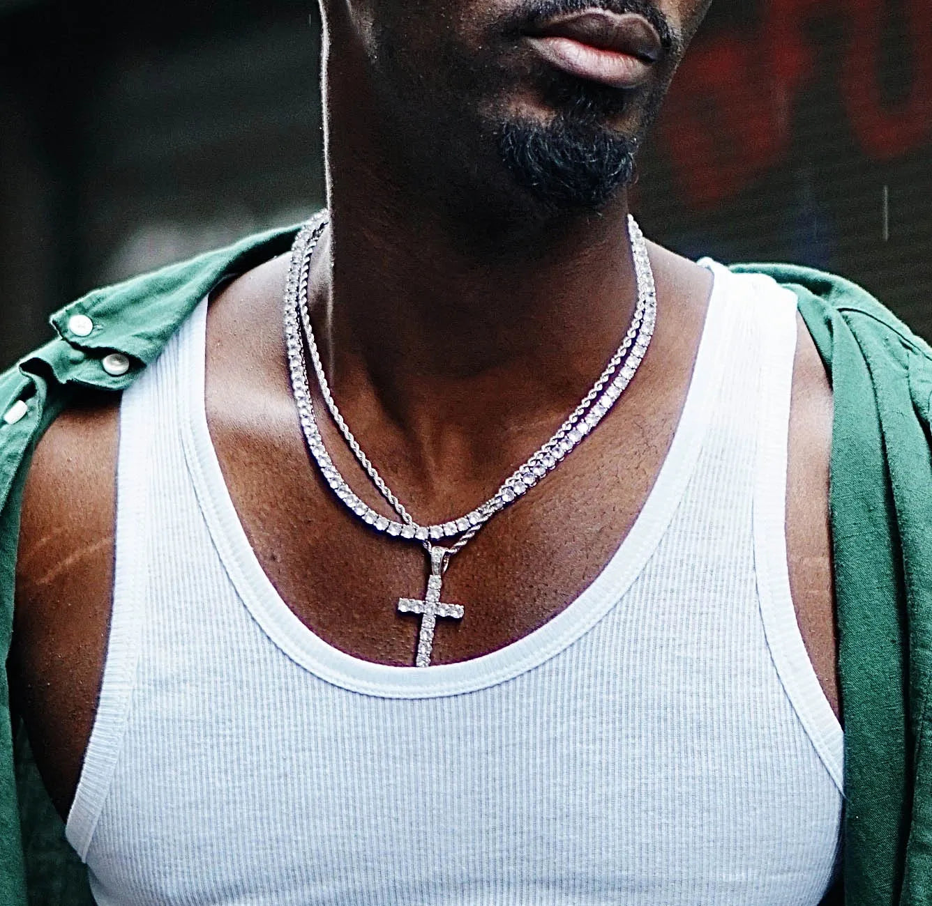 Complete su look con un reluciente reloj Iced-Out que combina a la perfección con la pulsera tenis y el collar. Un colgante con el nombre personalizado añade un toque personal y redondea el look general.