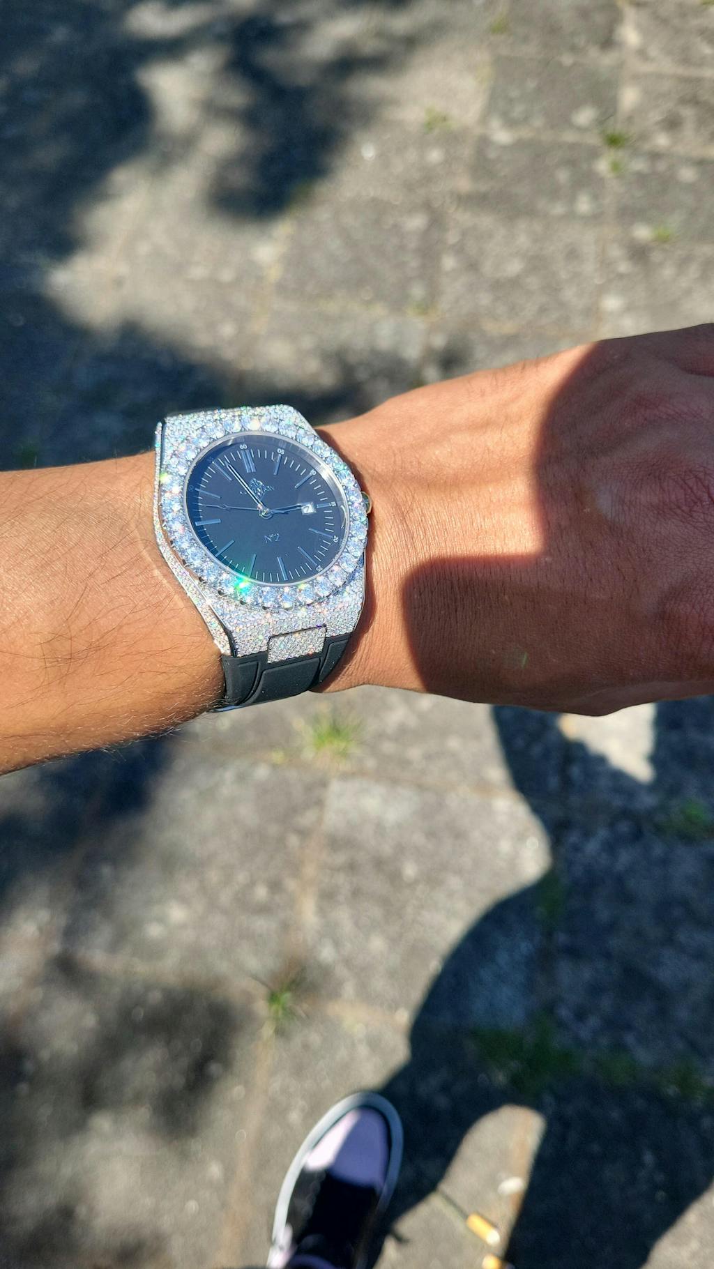 Vervollständigen Sie Ihren Look mit einer funkelnden Iced-Out Uhr, die perfekt zum Tennisarmband und der Halskette passt. Ein individueller Namensanhänger fügt eine persönliche Note hinzu und rundet das Gesamtbild ab.